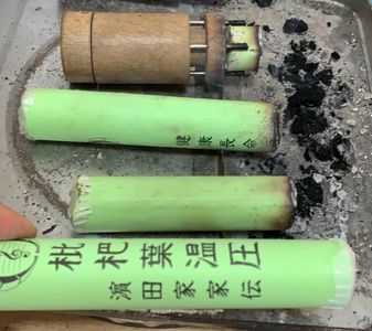 全身のツボにびわの葉をあて、ガーゼ、紙をあて、その上からよもぎ100%の太いもぐさ棒をツボに押し当てます。もぐさ棒の遠赤外線効果、指圧効果、びわの葉の効果、と3つの効果をもって、体の気の循環を促進し、体を温め、自然治癒力を目覚めさせ、自らの体の不具合を自己修正します。